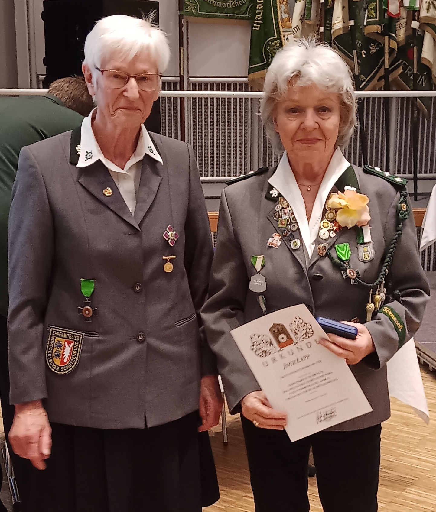 Inge hatte im vorgesehenen Ehrungsjahr 2023 nicht die Möglichkeit die Ehrung persönlich in Empfang zu nehmen. Am 05. Mai dieses Jahres war es dann endlich so weit. Auf dem diesjährigen Landesschützentag wurde die Urkunde und das Ehrenkreuz in Bronze des Deutschen Schützenbundes übergeben, als Zeichen des Dankes und Anerkennung für das über 37-jährige Engagement im Ehrenamt.