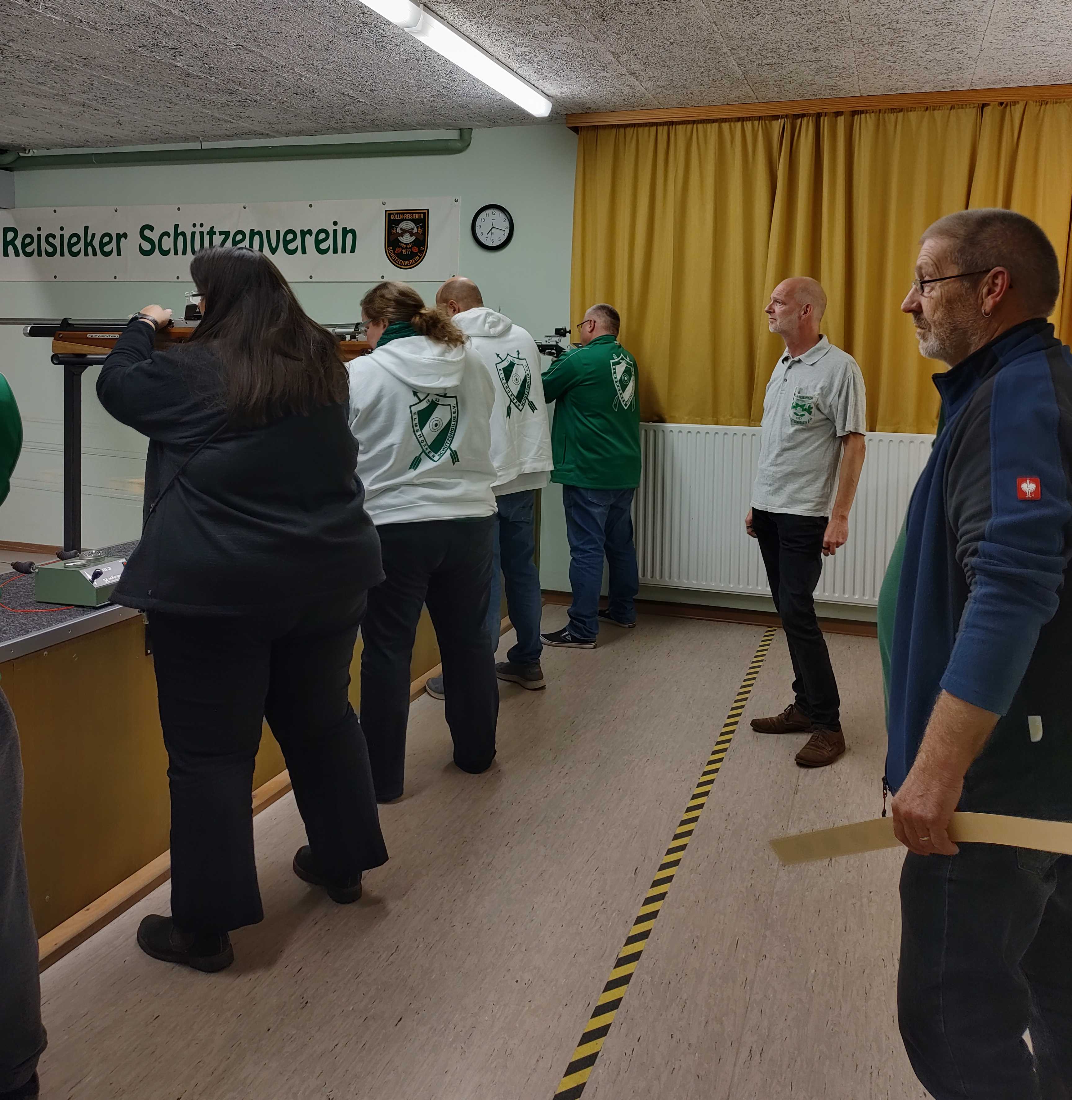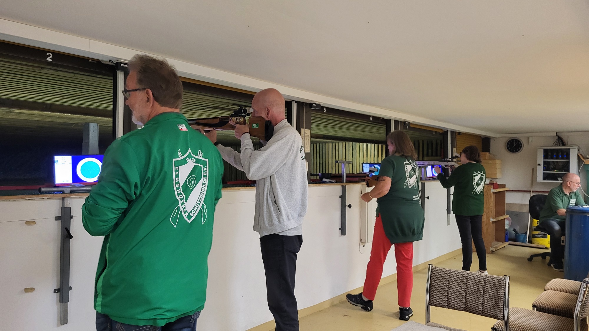 Nach der Begrüßung wurde erstmal mit dem namengebenden Teil des Abends begonnen. Üblicherweise wird, zur Abwechslung für die Druckluftschützen aus Kölln-Reisiek, bei der ESG mit dem KK-Gewehr geschossen. Die Schützenmeister beider Vereine denken sich für jeweiligen Treffen dafür nach Möglichkeit wechselnde Herausforderungen aus. Traditionell gehört es dazu, auch eine Scheibe auszuschießen, die der Schütze mit dem besten Treffer mit in seinen Verein nimmt.